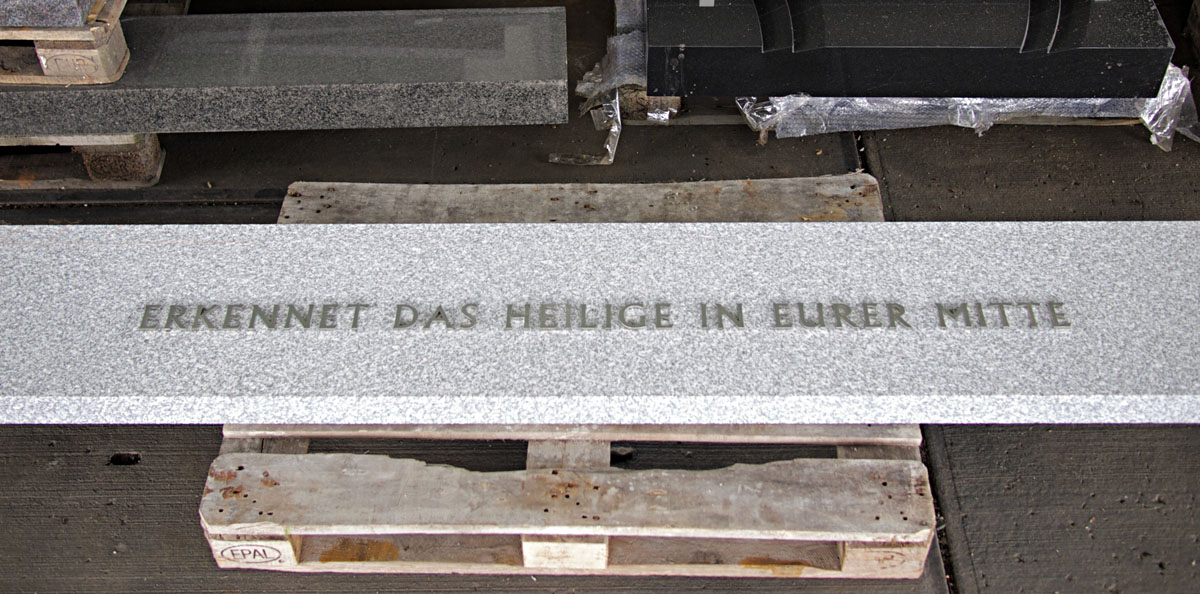 Die 1. Stufe am Eingang zum Friedensmal bei der Fertigung, Firma Kurz Natursteine, Bensheim