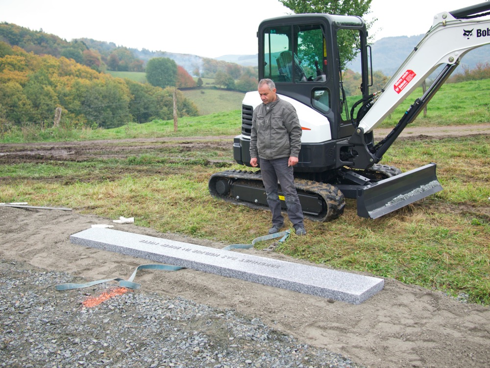 Ismael, der muslimische Chef des Bauunternehmens, das von der Firma Kurz beauftragt worden war die Stufen des Denkmalkreises zu legen, spricht ein kurzes Gebet in einer Minute der Andacht. 24 solcher Stufen aus Granit werden die "Schwelle der Demut" bilden. Die erste Stufe wurde exakt nach Jerusalem ausgerichtet. Die Inschrift der ersten Stufe lautet: Erkennet das Heilige in eurer Mitte.